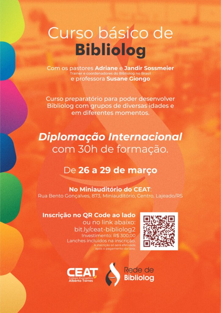 O curso contará com a orientação dos pastores Adriane e Jandir Sossmeier, trainers e coordenadores do Bibliolog no Brasil, e da professora Susane Giongo, oferecendo uma experiência formativa consistente e vivencial.